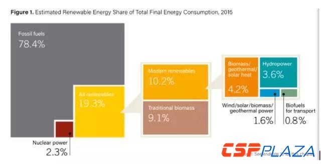 據2017年REN21報道,2015年最終能源消費中的再生能源份額如圖,化石燃料仍然占據主導地位。