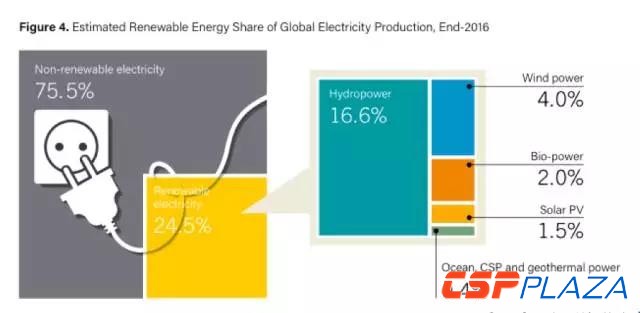 再生能源主要應用于發電。電力生產結構指來自一次能源生產電力的比例,以%表示。根據2017年REN21的報告可以看見下圖。截止2016年全球再生能源發電占電力總量的24.5%,其中水力發電最高,占16.6%,其次是風電場占4.0%、生物質發電占2.0%和光伏發電占1.5%。