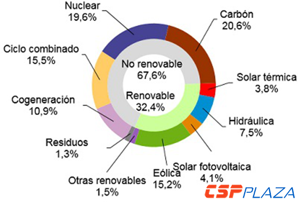 據(ju)西班牙有(you)關部(bu)門發(fa)(fa)(fa)布的(de)各類能(neng)源7月份發(fa)(fa)(fa)電(dian)量(liang)占(zhan)(zhan)(zhan)比(bi)結果顯示,核能(neng)、煤炭、聯(lian)(lian)合循環、風(feng)電(dian)分(fen)別占(zhan)(zhan)(zhan)比(bi)20.6%、18.8%、17.8%和15.5%;熱電(dian)聯(lian)(lian)產、水力發(fa)(fa)(fa)電(dian)、光伏(fu)發(fa)(fa)(fa)電(dian)、廢(fei)料發(fa)(fa)(fa)電(dian)則分(fen)別占(zhan)(zhan)(zhan)比(bi)10.8%、5.3%、4.2%與1.3%,其它可再生能(neng)源占(zhan)(zhan)(zhan)比(bi)1.6%。其中,可再生能(neng)源發(fa)(fa)(fa)電(dian)量(liang)占(zhan)(zhan)(zhan)比(bi)達31%,51.3%的(de)發(fa)(fa)(fa)電(dian)量(liang)來自不排放(fang)二氧化(hua)碳的(de)發(fa)(fa)(fa)電(dian)技術(shu)。
