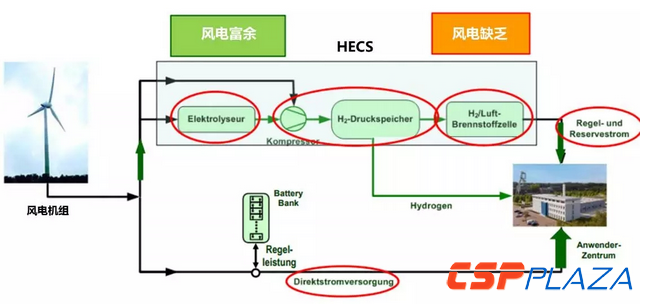 為了讓靠天吃飯的風電能夠滿足地區供電的可靠性要求,該項目的核心為將多余的風電用于電解生產氫氣,氫氣能夠很好地被儲存起來,在缺電的時候通過燃料電池重新轉化為電力。這個流程被定義為:以氫能為基礎的能源補充系統(HECS),其基礎框架如下: