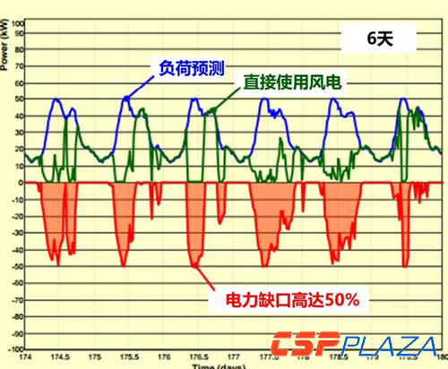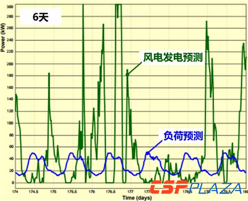 這個項目的HECS設備能夠提供每年250兆瓦時的電力和將近6500千克的氫氣。一部分氫氣通過燃料電池為附近的一個辦公建筑提供足夠的電力,這棟建筑中午的峰值負荷能夠達到50KW,全年用電量在250兆瓦左右。為了能夠制定出最優的風電充放電策略,該系統配備了一套風力發電預測系統和負荷預測系統,一個通過該系統計算出的6天風電發電功率和負荷的如下: