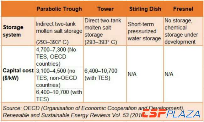 在每個電站中,由于儲能系統選用的技術類型和匹配容量的不同,其在光熱電站總成本中所占比例約為10%~20%。據國際可再生能源署IRENA發布數據顯示,隨著儲能溫度的逐步提高,儲能系統的設計不斷優化,到2025年,拋物線槽式電站的儲能成本可降低38%,約26美元/kWhth;而塔式電站的儲熱成本則可降低17%,達到22美元/kWhth。美國能源部SunShot Initiative計劃的既定目標則是到2020年將儲能成本降至15美元/kWhth。