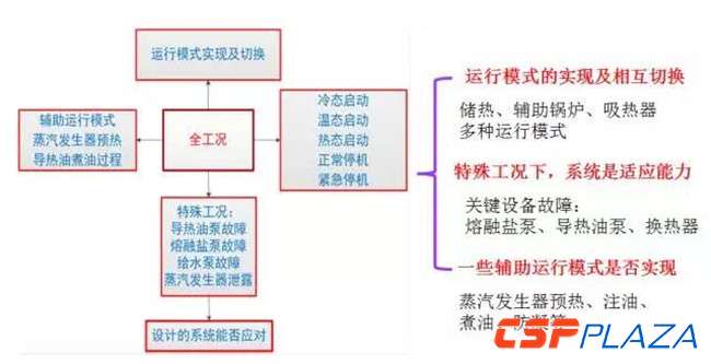 系統除了冷態啟動,溫態啟動,熱態啟動,正常停機,緊急停機外,還要考慮蒸汽發生系統的預熱等輔助運行過程、一些故障工況以及多種運行模式之間如何切換。設計太陽能熱發電系統應該滿足這些要求。