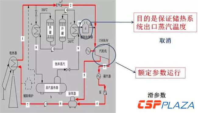 我用中科院電工所八達嶺1MW塔式電站簡單舉個例子,這是“十一五”的科技項目。在前期設計時,我們在儲熱系統出口設計有一個鍋爐,目的是保證進入汽輪機前的蒸汽參數要達到額定參數。該儲能系統是兩級儲能,蒸汽蓄熱器是出來的飽和蒸汽,通過上面的導熱油加熱進行加熱,到達過熱蒸汽。在設計之初,我們的出發點是通過一個鍋爐地來保證來自儲熱系統的蒸汽參數為額定參數。但通過仿真結果發現,在儲熱系統出口的加熱器存在一定的問題,發現它是一個多余的設備,