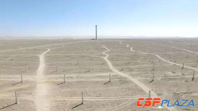 作為首批光熱發電示范項目的建設基地之一,該電站有全球單機最大的聚光集熱鏡場,共一萬余臺定日鏡。截止目前,已完成定日鏡基礎8000多個,定日鏡立柱開始安裝,且定日鏡組裝車間完成封頂。