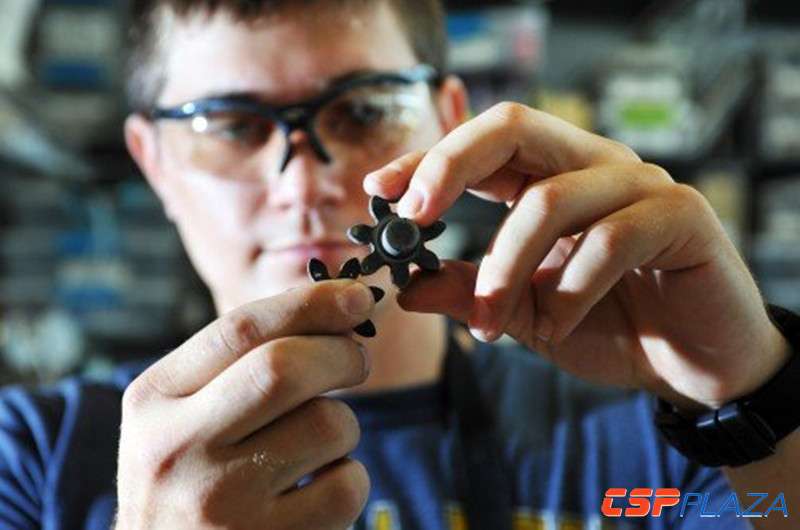 圖:Caleb Amy演示兩個陶瓷齒輪如何嚙合在一個泵上(圖片來自喬治亞理工大學)