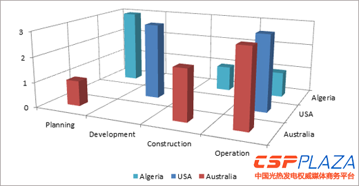 美國、阿爾及利亞和澳大利亞總計擁有17個上述類型的光熱發電項目,占據39.5%的份額。阿爾及利亞的相關項目50%以上尚在規劃開發階段,澳大利亞則正好相反,50%以上的項目已經在建設和運行階段(見圖表6)。而全球范圍內,上述相關項目當前的所在階段分布如圖表7。