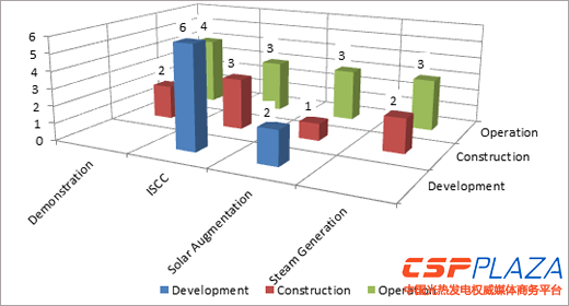 光熱發電技術的上述獨特應用市場正引起工業各界對其越來越大的興趣,在全球已經開始應用光熱發電技術的國家中,高達76%數量的國家都有上述光熱發電技術的應用型項目出現,在這些國家中,又有48%的國家開發的光熱電站項目有將近50%的項目為混合型或非常規光熱電站。