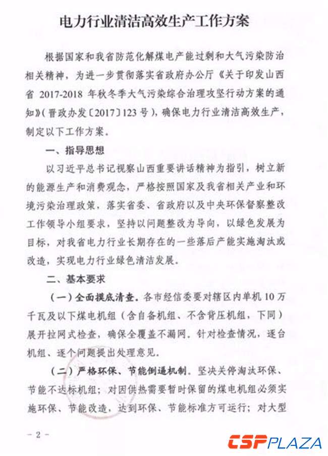 ??為進一步落實省政府辦公廳《關于印發山西省2017-2018年秋冬季大氣污染綜合治理攻堅行動方案的通知》(晉政辦發〔2017〕123號)精神,推進電力行業清潔高效生產,解決我省電力行業一些落后產能長期存在的問題,特制定《電力行業清潔高效生產工作方案》,現印發你們,請認真組織落實,抓好整改實施。
