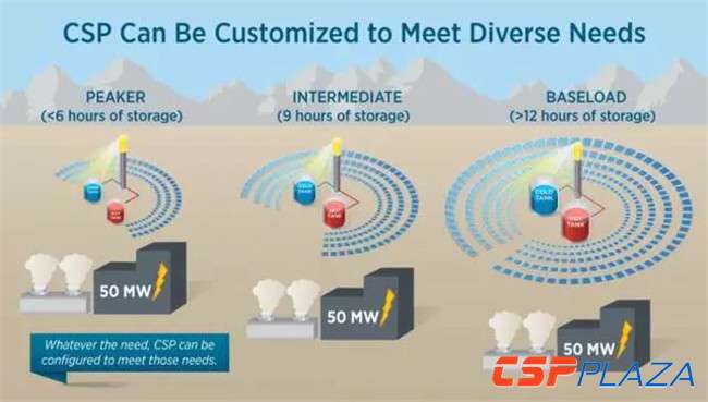 因為用電需求在不斷變化,國家需要光熱技術靈活的按需供應。小容量的裝機可以以較低的前期成本提供用電高峰期所需電力,而擁有幾個小時儲能能力的大容量裝機可以解決基本負荷。比如一個儲能時間少于6小時的50MW的光熱電站可以成為調峰電站,當用電需求突然猛增時,這個電站可以成為基本負荷的補充。如果電廠儲能大于12小時、配備更大鏡場時,就可以用來滿足基本負荷——白天和黑夜無間斷供電。