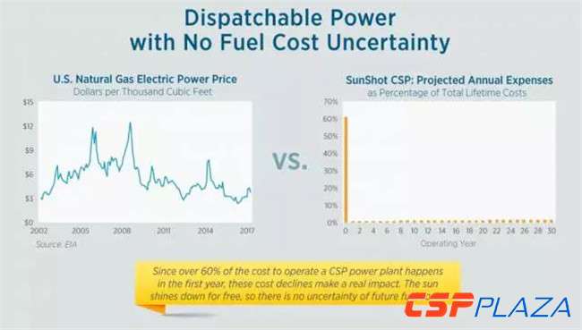 光熱最大的兩個優勢就是穩定和可預測的成本。不像傳統燃料,太陽是充足和源源不斷的。因為“燃料”是免費的,那么電廠運營、維護的成本都是可預測的。另外,超過60%的運營成本都產生在第一年,那么投資者們對資金投入和回報可以有更長遠的了解。
