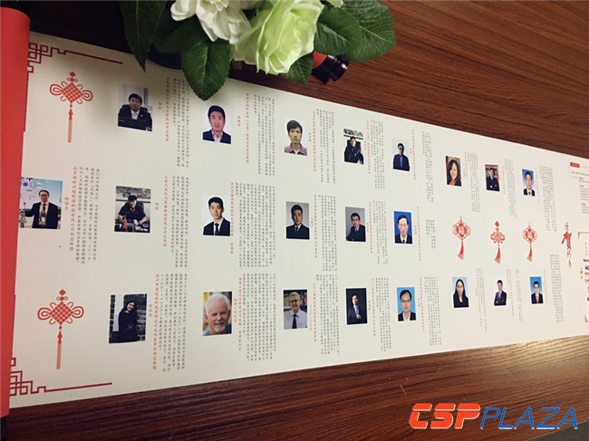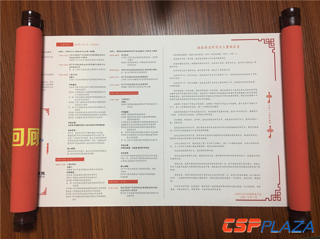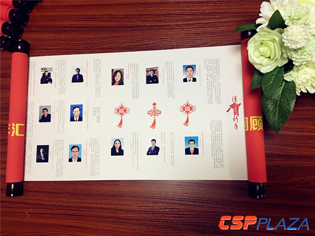 畫軸總長1.4米。從右至左,分別是《新年獻詞:站在歷史的節點上勇敢出發》、《CSPPLAZA2018新年匯大會日程》、《贊助商LOGO展示墻》以及《新春寄語》四部分組成。