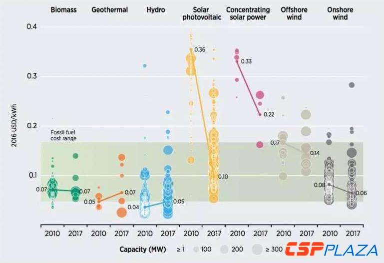 CSPPLAZA光熱發電網訊:近日,國際可再生能源署(IRENA)發布了《可再生能源發電成本報告》,披露了全球范圍內2017年投運的生物質發電、地熱發電、水電、陸上風電、海上風電、光熱發電、大型地面光伏的加權平準發電成本(LCOE,以2016年美元不變價格計算)。