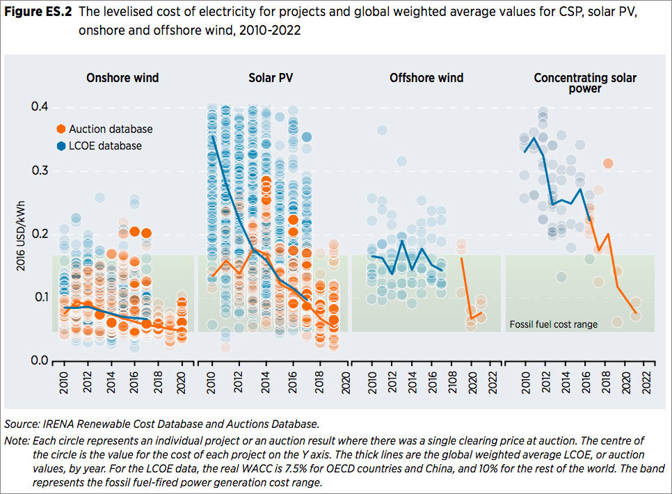 報告顯示,無論是近期數據還是未來預計,光熱發電、光伏發電、海上風電、陸上風電四種主要可再生能源的發電成本均明顯下降。IRENA認為,成本下降主要源于以下因素:1)競標機制讓成本更加透明化;2)國際競爭將大量經驗豐富的開發商帶入新興市場,其專業技術、購買力和進入國際金融市場的便利性進一步降低了項目成本和風險;3)技術進步帶來的效率提高。