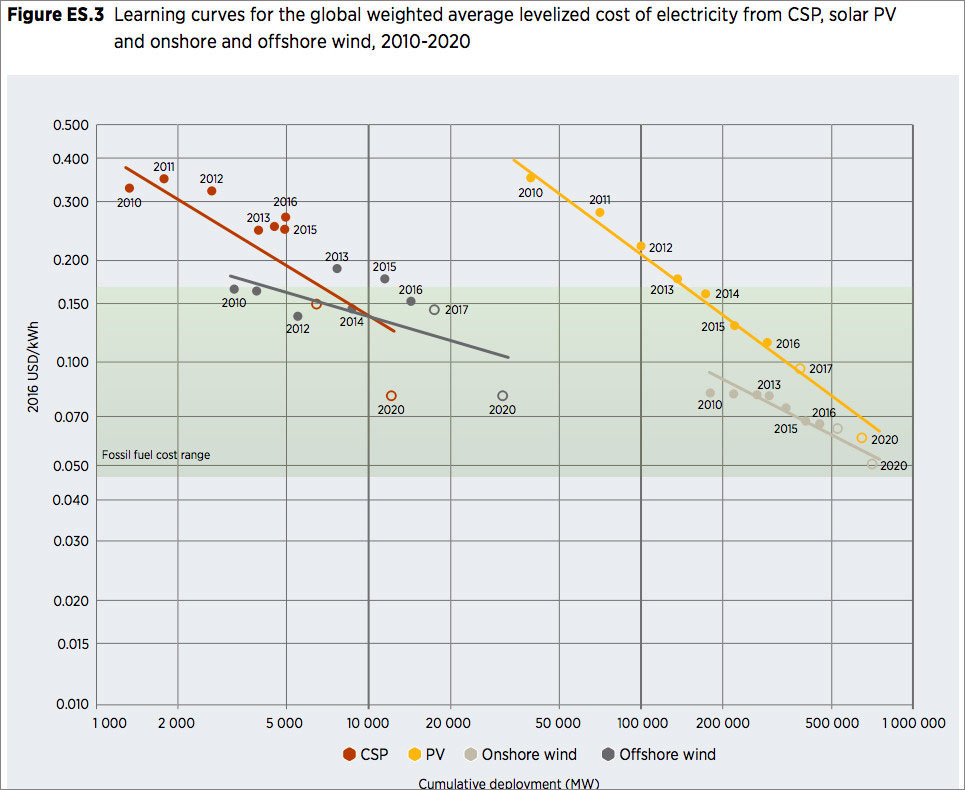 IRENA根據學習曲線模型估計,2010年到2020年期間,光熱發電的學習率有望達到30%(學習率,learning rate,學習曲線效應的量化值,即裝機規模每翻一番,成本會隨之下降的百分比),而海上風電、陸上風電和光伏發電的學習率則分別為14%、21%和35%。