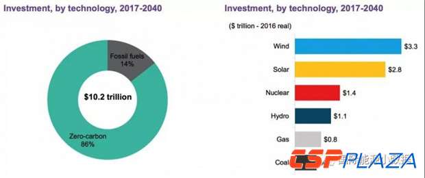 巨額的資金正在流向可再生能源的開發。根據彭博新能源財經的數據,2017-2040年全球新增電力裝機投資將達10.2萬億美元,其中86%用于可再生能源發電裝機。