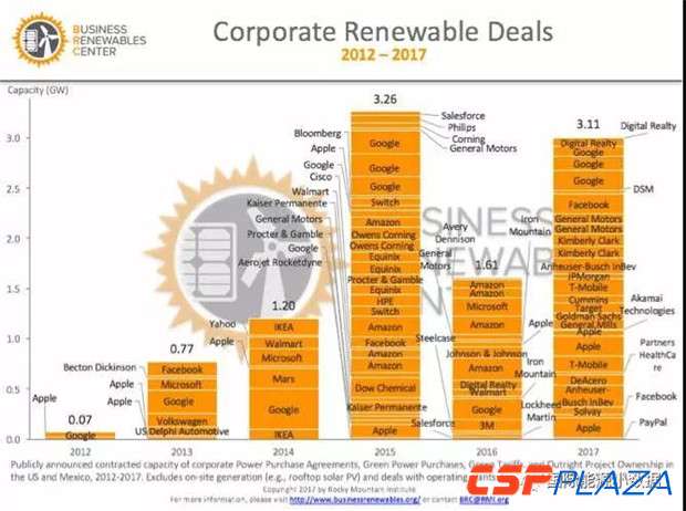 各國公司以可再生能源供電為榮,這一趨勢還在持續擴大。到2017年止,各國大公司(如谷歌、Facebook)簽下的可再生能源供電累計達到10吉瓦,其中3吉瓦是2017年新簽購電合同。