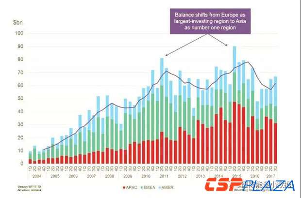 首先,全球可再生能源投資增長速度近年來已經放緩,而且增長驅動主要來自亞洲少數國家(主要是中國)和北美,歐洲的可再生能源投資額已經萎縮。可再生能源投資增長總額放緩固然與可再生能源成本下降直接有關(因為成本下降,投資相同美元所能買到的新增裝機容量增加),但是也與各國補貼力度下降有關。