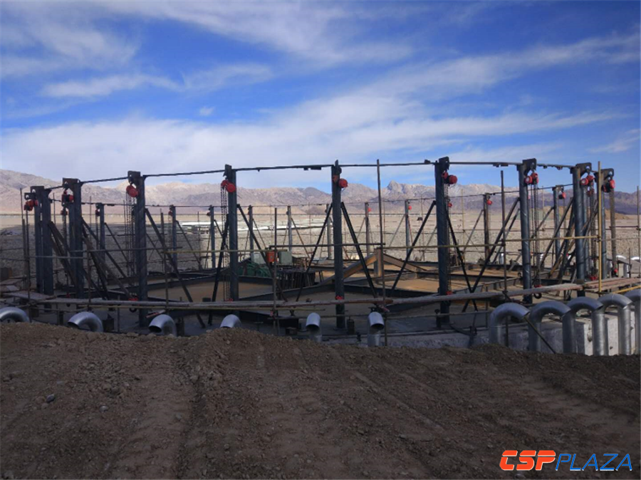 完成冷鹽罐和熱鹽罐的基礎施工,完成冷鹽罐和熱鹽罐的底板焊接,完成熱鹽罐的拱頂和第六圈板焊接,完成換熱系統平臺及泵平臺基礎施工及土方回填,鏡場定日鏡立柱已完成約7200套,定日鏡累計安裝近6000面。