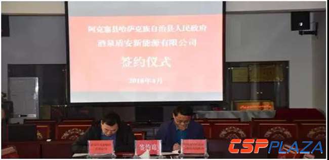 會后,阿克塞縣人民政府與酒泉盾安新能源有限公司簽訂了光熱開發框架協議。協議包括酒泉盾安新能源有限公司計劃投資56億元,建設裝機總量為2*100MW熔鹽塔式光熱發電項目,同時配套建設與建設規模相匹配的變電站及輸電線路。