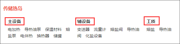 傳儲熱島則分為主設備、輔設備和工質三部分,主要涉及換熱器、熔鹽泵、熔鹽閥、流量計、電加熱/電伴熱等裝備以及熔鹽、導熱油等傳儲熱工質,詳見下圖: