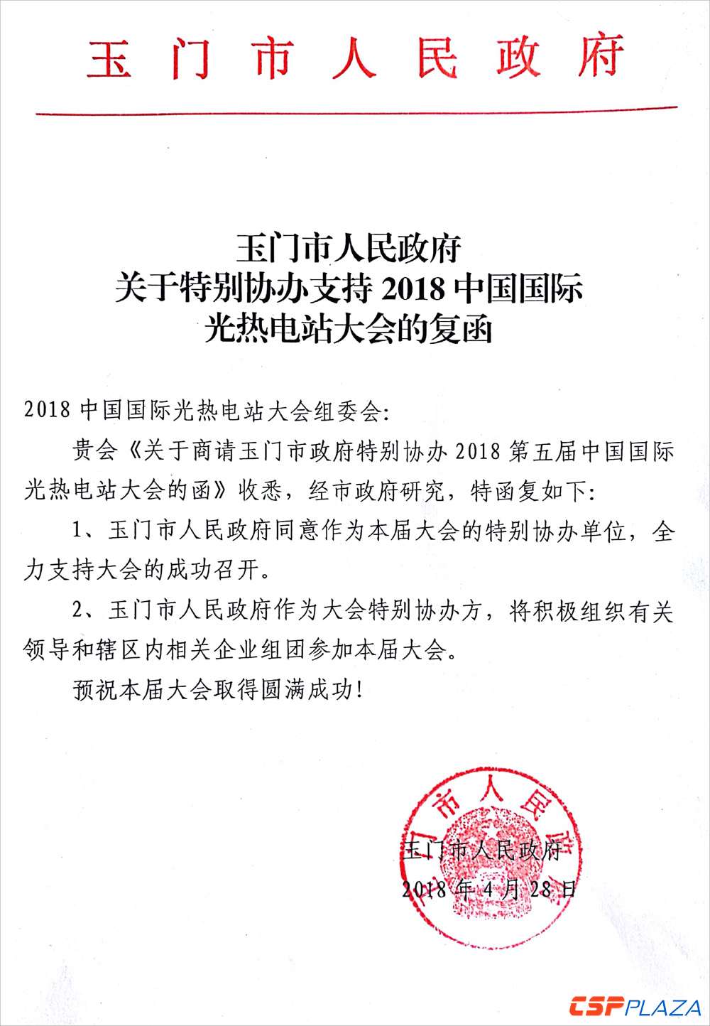 CSPPLAZA光熱發電網訊:4月28日,甘肅省玉門市人民政府函復2018中國國際光熱電站大會組委會,確認將作為本屆大會的特別協辦單位全力支持大會的成功召開。作為大會特別協辦方,玉門市人民政府將積極組織有關領導和轄區內相關企業組團參加本屆大會。