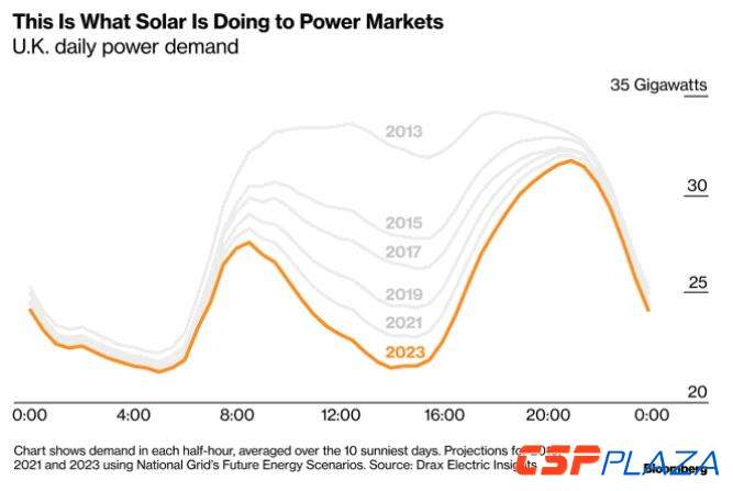太陽能發電影響電價。早上9點太陽能產能激增,晚上9點太陽能產能減少,而此時電力需求大,所以仍需要天然氣和煤電滿足需求。太陽能產能每天中午達到峰值,電價此時最低。