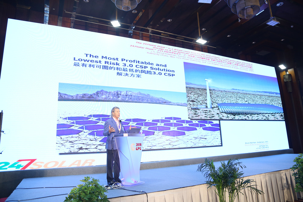 CSPPLAZA光熱發電網報道:6月20-22日,第五屆中國國際光熱電站大會暨CSPPLAZA年會2018(CPC2018)在北京召開,美國247 Solar公司首席執行官Bruce Anderson出席了本次大會并發表了題為“一種簡單、低成本的適用于中國市場的光熱發電技術”的演講。