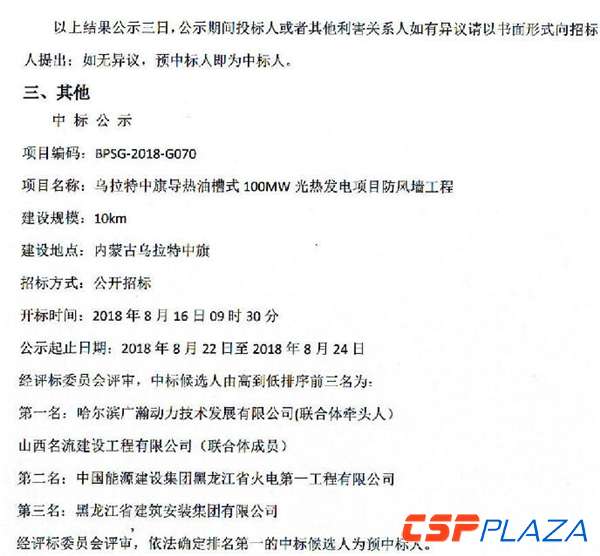 CSPPLAZA光熱發電網訊:內蒙古烏拉特中旗槽式100MW光熱發電項目防風墻工程中標公示今日發布,公示結束時間為8月24日。哈爾濱廣瀚動力技術發展有限公司和山西名流建設工程有限公司聯合體為第一中標候選人,投標報價為1726萬元,工期/交貨期/服務期為50天。
