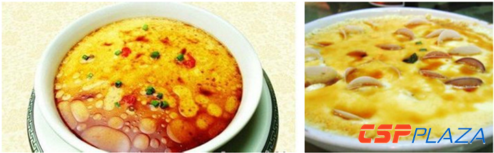 青(qing)海高原盛產的(de)發(fa)菜(cai)(cai)是山珍之一,在(zai)封建社(she)會(hui)作為供(gong)奉(feng)皇室的(de)一宗(zong)貢(gong)品,唐、宋時已遠銷(xiao)國(guo)外。青(qing)海人以發(fa)菜(cai)(cai)作主料(liao)烹調的(de)發(fa)菜(cai)(cai)蒸蛋(dan),有人雅(ya)稱“黃(huang)金白銀(yin)烏絲糕”,做法是雞蛋(dan)黃(huang)白分離,攪(jiao)打(da)勻稱,并調精鹽、姜(jiang)粉、花椒(jiao)等(deng)粉末佐料(liao),以蛋(dan)白襯底,上(shang)(shang)覆蓋洗凈(jing)的(de)發(fa)菜(cai)(cai),先(xian)上(shang)(shang)籠蒸到發(fa)菜(cai)(cai)和(he)蛋(dan)白凝結,固(gu)定成形后,在(zai)上(shang)(shang)層傾入攪(jiao)勻的(de)蛋(dan)黃(huang)繼續蒸到熟透,在(zai)蒸碗中用刀劃成方(fang)形或菱形,反扣湯盤(pan)中心(xin),上(shang)(shang)澆羊肉湯(牛肉湯、雞湯均可),湯汁中放木(mu)耳(er)、黃(huang)花、筍片、香菜(cai)(cai)末等(deng),最后撒幾(ji)滴香油上(shang)(shang)桌(zhuo)。