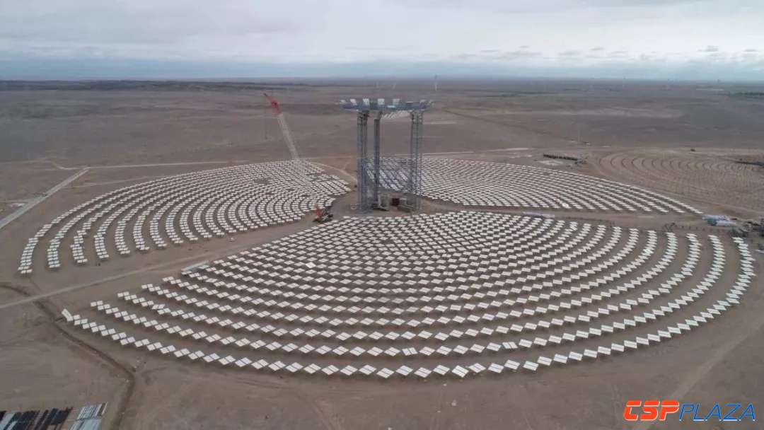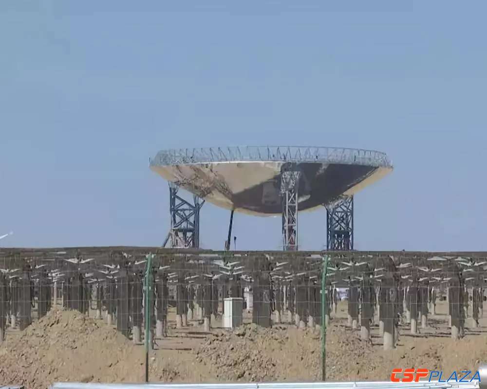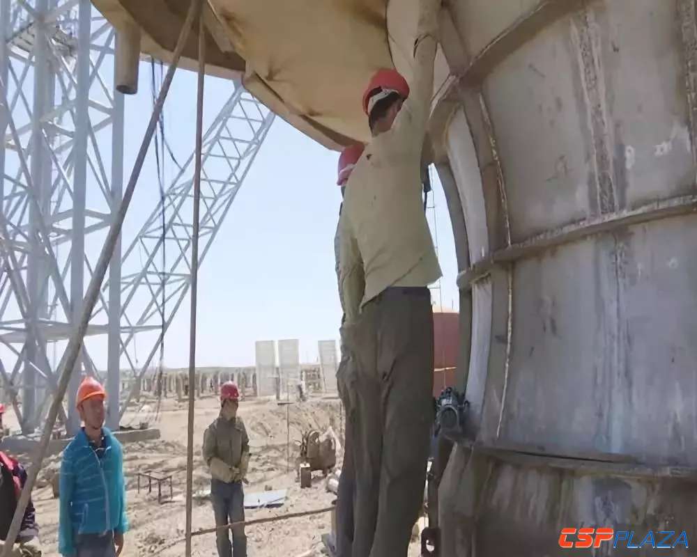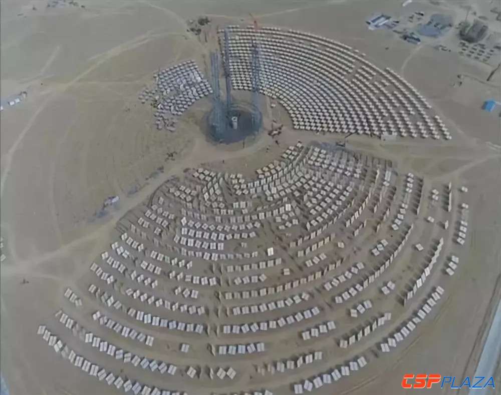 目前,項目1號模塊已建成,2號模塊二次塔拼裝完成,球形網架提升14.5m,定日鏡安裝完成357套;3號模塊二次塔拼裝30%,定日鏡基礎澆筑全部完成,開始安裝;4-10號模塊基礎土建和塔架焊接工程正在進行;已完成主廠房框架、中央冷、熱熔鹽罐安裝、110kv和35kv配電室及35kV架線,其他附屬建筑正在有序施工,計劃2018年底1-5號模塊建成并網。