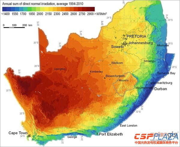 在Pofadder、Aggeneys和Springbok地區,DNI值也很高。目前在Pofadder附近,Abengoa正在建設100MW的KaXu Solar One槽式光熱發電項目。