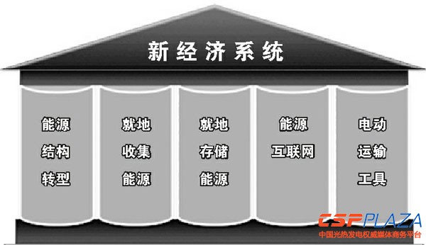 這些支柱包括:(1)向可再生能源轉型;(2)將每一棟建筑轉化為微型發電廠,以便就地收集可再生能源;(3)在每一棟建筑物以及基礎設施中使用氫和其他存儲技術,以存儲間歇式能源;(4)利用互聯網技術將每一棟建筑的電力網轉化為能源共享網絡,這一共享網絡的工作原理類似于互聯網(成千上萬的建筑物能夠就地生產出少量的能源,這些能源多余的部分既可以被電網回收,也可以通過聯網而共享);(5)將運輸工具轉向插電式以及燃料電池動力車,這種電動車所需要的電可以通過共享的電網平臺進行買賣。