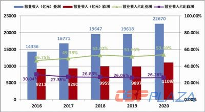 圖(tu)8 2016-2020年“500強(qiang)”亞洲(zhou)、歐(ou)洲(zhou)企(qi)業營業收(shou)入(ru)及其占比對比