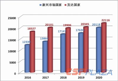 圖(tu)5 2016-2020年“500強”企(qi)業(ye)中新興市場國家與發達國家企(qi)業(ye)總營業(ye)收入(ru)(億(yi)元)