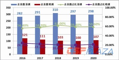 圖7 2016-2020年“500強”亞(ya)洲、歐洲企(qi)業數(shu)及(ji)其(qi)占比對比
