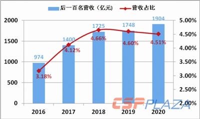 圖16 2016-2020年“500強”后100名(ming)企(qi)業營業收入及占比(bi)情(qing)況(kuang)