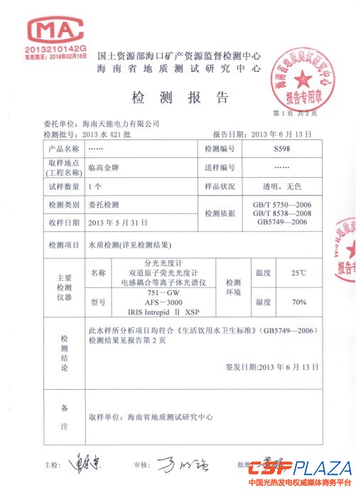 圖:海南省(sheng)地質資源測試研究中心出具的水質報告