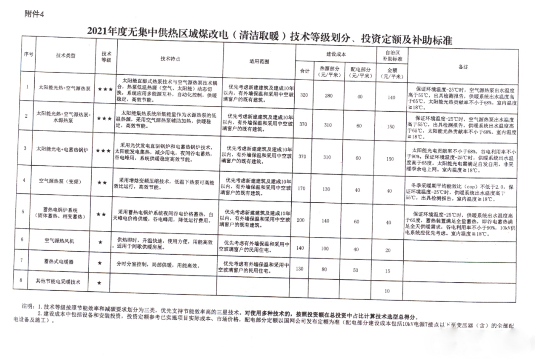 根據通(tong)知(zhi),自治(zhi)區按(an)(an)照(zhao)技術(shu)等級分類確定補助標(biao)準,其中采用(yong)三星技術(shu)的(太(tai)(tai)陽(yang)能光熱(re)(re)(re)(re)(re)+空(kong)氣源(yuan)熱(re)(re)(re)(re)(re)泵(beng)(beng)(beng)、太(tai)(tai)陽(yang)能光熱(re)(re)(re)(re)(re)+空(kong)氣源(yuan)熱(re)(re)(re)(re)(re)泵(beng)(beng)(beng)+水源(yuan)熱(re)(re)(re)(re)(re)泵(beng)(beng)(beng)、太(tai)(tai)陽(yang)能光電(dian)(dian)(dian)+電(dian)(dian)(dian)蓄(xu)熱(re)(re)(re)(re)(re)鍋(guo)爐(lu)(lu)),按(an)(an)照(zhao)140-150元/平方米(mi)(mi)給(gei)(gei)予(yu)補助;采用(yong)二星技術(shu)的(空(kong)氣源(yuan)熱(re)(re)(re)(re)(re)泵(beng)(beng)(beng)(變頻)、蓄(xu)熱(re)(re)(re)(re)(re)電(dian)(dian)(dian)鍋(guo)爐(lu)(lu)系統(固體蓄(xu)熱(re)(re)(re)(re)(re)、相變蓄(xu)熱(re)(re)(re)(re)(re))),按(an)(an)照(zhao)40元/平方米(mi)(mi)給(gei)(gei)予(yu)補助;采用(yong)一(yi)星技術(shu)的(空(kong)氣源(yuan)熱(re)(re)(re)(re)(re)風機(ji)、蓄(xu)熱(re)(re)(re)(re)(re)式電(dian)(dian)(dian)暖器、其他節能電(dian)(dian)(dian)采暖技術(shu)),按(an)(an)照(zhao)10-20元/平方米(mi)(mi)給(gei)(gei)予(yu)補助。