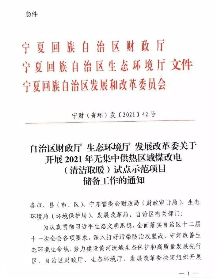 近日(ri),寧夏(xia)回族自治區財政廳(ting)、生態環境廳(ting)、發改委(wei)聯合(he)下發《關于開展2021年無集中供熱區域煤改電(清潔取暖(nuan))試點示(shi)范項目儲(chu)備工作的通(tong)知(zhi)》。