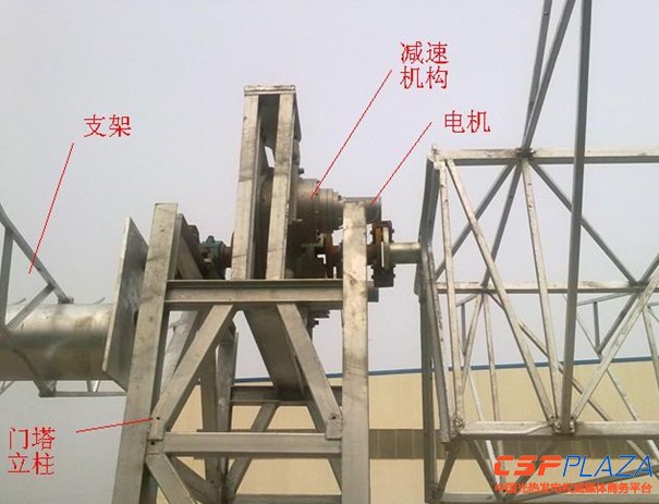 該機械機構,由驅動電機(交流電機、伺服電機或者步進電機,不同廠商不同)、減速機、聯軸器、驅動支架等構成。控制系統控制電機的正轉和反轉來驅動定日鏡旋轉到追蹤的位置。該裝置為了實現較精準的控制,一般會配有角度傳感器或者追日傳感器以實現閉環的控制。