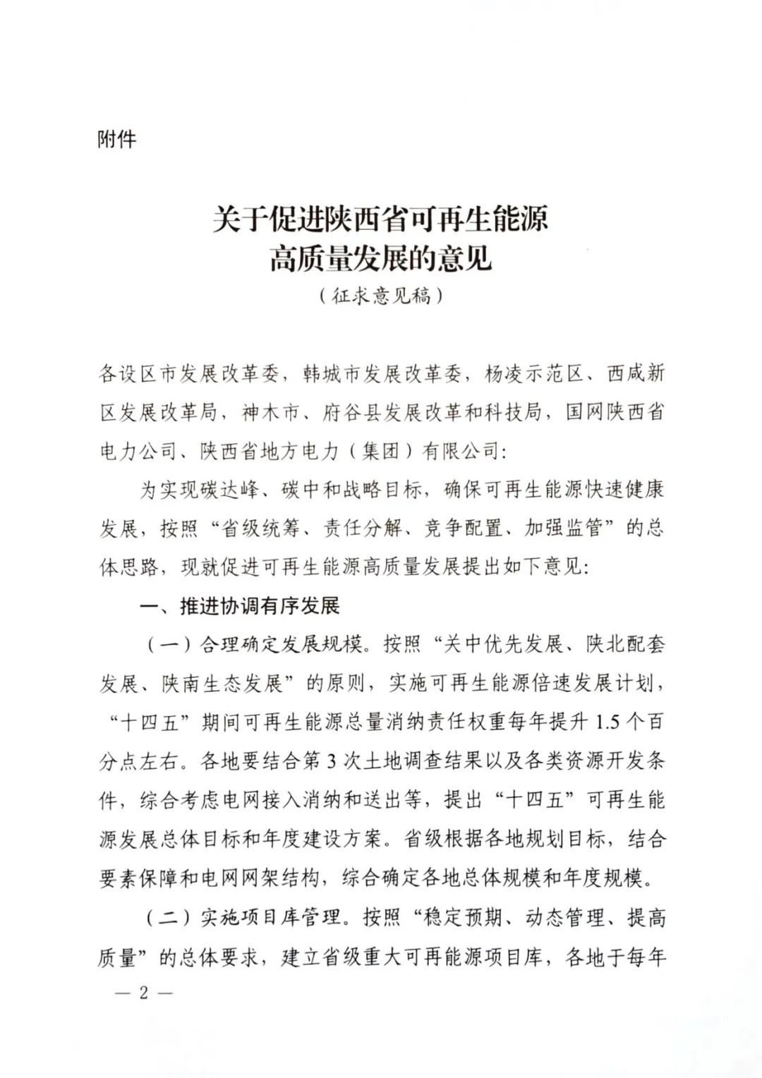日(ri)前,陜西(xi)(xi)省(sheng)能(neng)源(yuan)(yuan)局印發(fa)(fa)(fa)《關于促(cu)進陜西(xi)(xi)省(sheng)可再生(sheng)(sheng)能(neng)源(yuan)(yuan)高(gao)質量發(fa)(fa)(fa)展的意(yi)(yi)見(jian)》(征求意(yi)(yi)見(jian)稿),提出創新推進示范項目建設,鼓勵引導地方政府和企業創新發(fa)(fa)(fa)展和運營模式,建設一(yi)批風(feng)光儲氫、光伏+光熱、新能(neng)源(yuan)(yuan)實證平(ping)臺、離網型發(fa)(fa)(fa)電項目、可再生(sheng)(sheng)能(neng)源(yuan)(yuan)與傳統(tong)多(duo)能(neng)互補等(deng)工(gong)程示范。