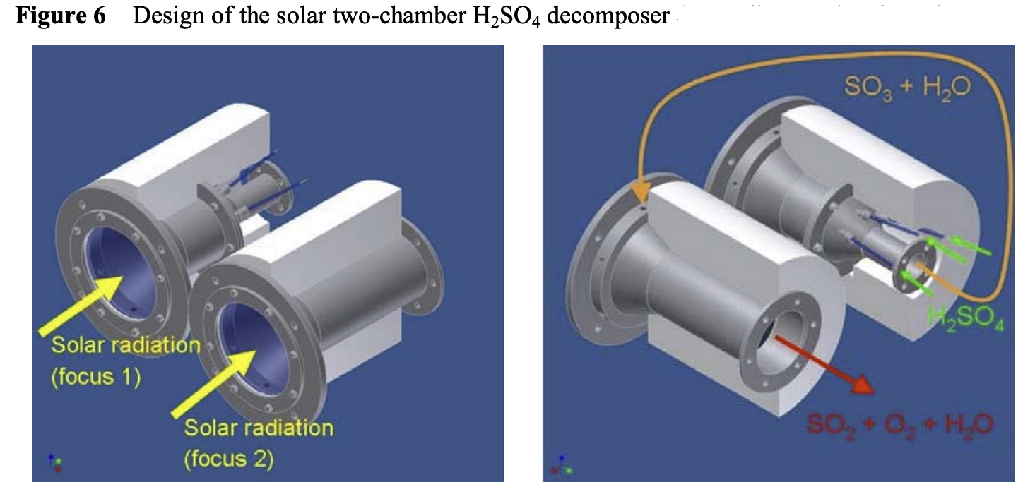 目前(qian),在(zai)德國(guo),澳(ao)大利亞,日(ri)本和美國(guo)的(de)(de)(de)國(guo)際研究小組(zu)已經設計并測試了這種高溫硫基工(gong)藝所(suo)(suo)需的(de)(de)(de)組(zu)成(cheng)(cheng)部件——太陽能反應器/蒸(zheng)發(fa)器,用于(yu)SO?分解的(de)(de)(de)熱交換器,以及SO?和O?的(de)(de)(de)氧氣(qi)分離(li)器。并確(que)定了使用由碳化(hua)硅制(zhi)成(cheng)(cheng)的(de)(de)(de)結構材(cai)料,該材(cai)料可以在(zai)腐蝕條件和執行熱化(hua)學所(suo)(suo)需的(de)(de)(de)極(ji)高溫度(du)下(xia)保持穩定性。