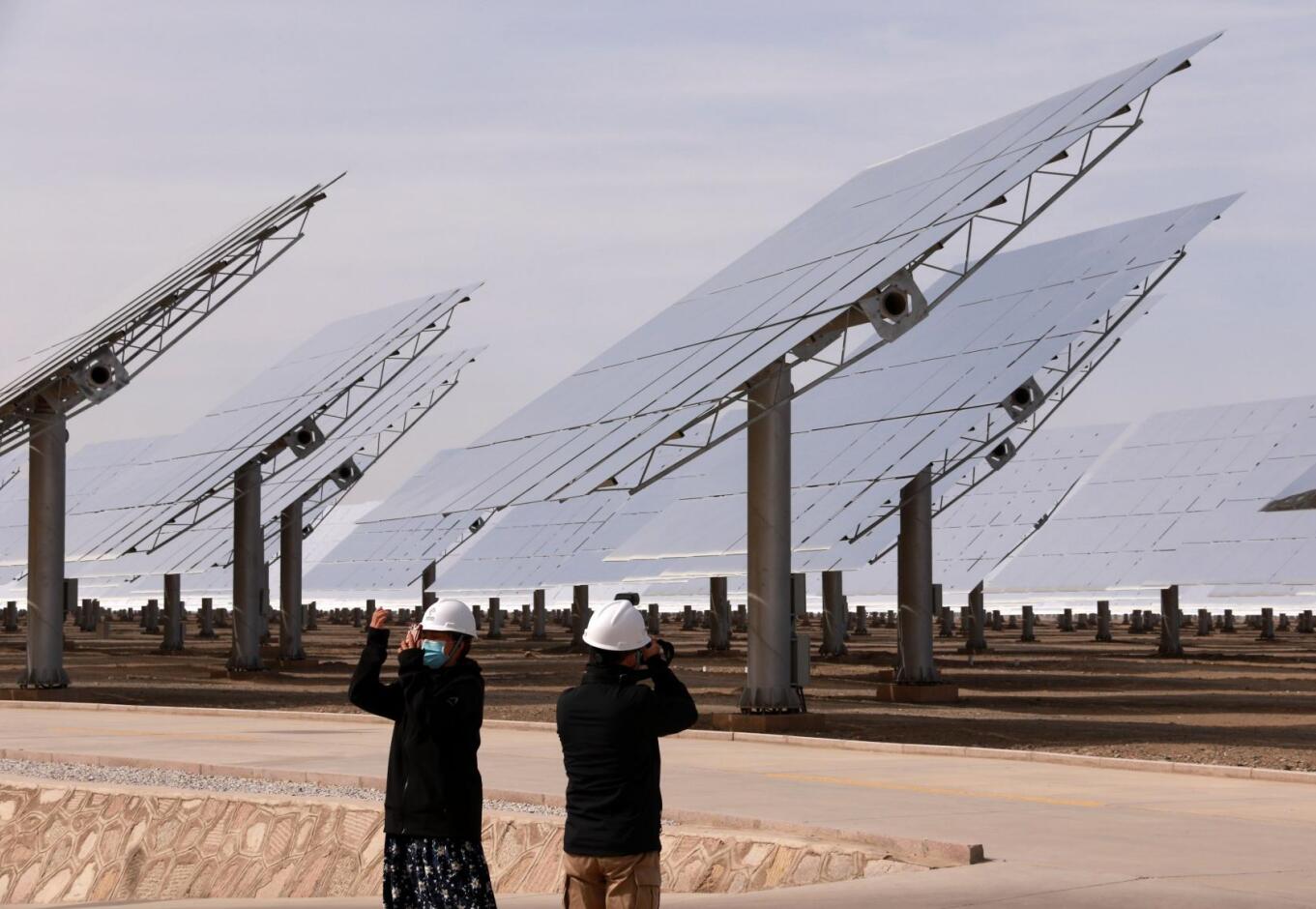2021年10月11日(ri),參觀者在甘肅省(sheng)敦煌市光電產(chan)業園區首航節(jie)能100兆瓦塔式熔鹽光熱發電站(zhan)參觀。