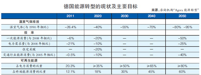 重大的轉變發生在2010年,當年德國通過的一項新法案將核電站的關閉時間由原定的2022年延遲到使用期滿。2011年3月的福島核事故為德國敲響了警鐘,使這項不得人心的決議僅存活了六個月就慘遭淘汰,也促使醞釀20年之久的轉型計劃終獲突破。5月29日,德國總理默克爾做出了一個歷史性決定——2022年前關閉境內所有17座核電站,德國將成為第一個明確去核化國家,并宣布了一項雄心勃勃的新能源計劃:2022年前,將太陽能、風能等可再生能源的比重提高到35%左右。這就是之后被世人津津樂道的德國“能源轉型”。(“能源轉型”現狀與目標見圖表)