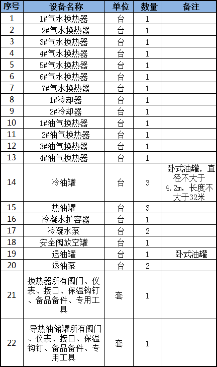 換熱器、導熱油儲(chu)罐(guan)系統及(ji)其輔助設備【詳(xiang)見(jian)下表(biao)】: