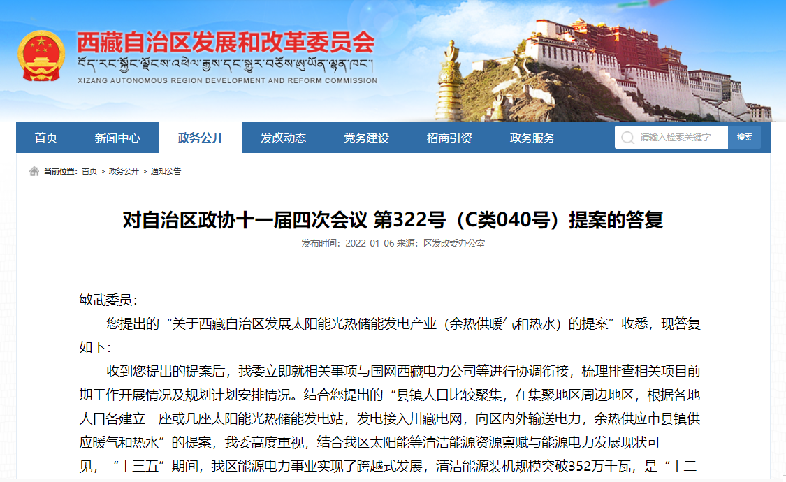 您提出的“關于西藏(zang)自治區(qu)發(fa)展太(tai)陽能光熱儲(chu)能發(fa)電產業(余熱供(gong)暖氣(qi)和熱水)的提案”收(shou)悉(xi),現答復如下: