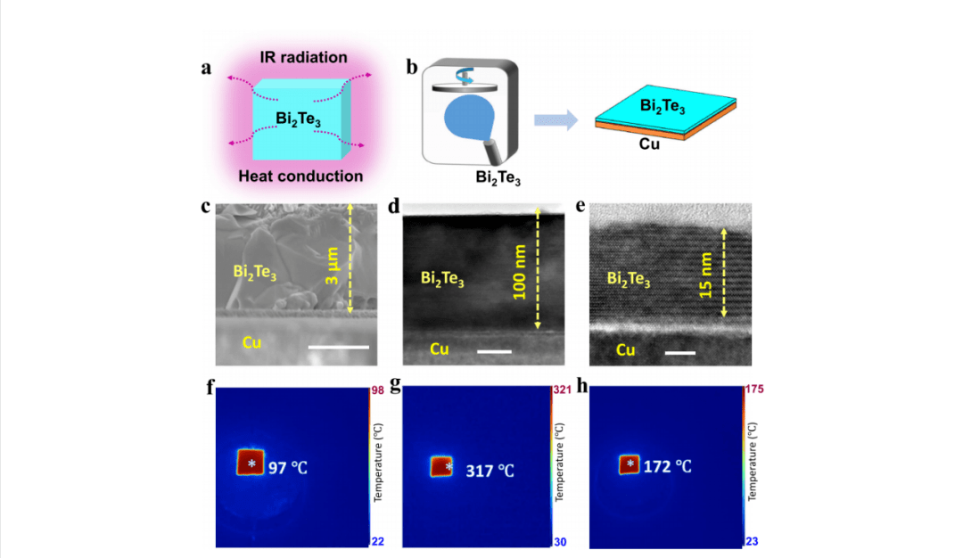 另外(wai),還(huan)需減(jian)少紅(hong)外(wai)發射,為(wei)(wei)此(ci)他們選擇(ze)具(ju)有強烈紅(hong)外(wai)輻射反射能力的(de)金(jin)屬銅作(zuo)為(wei)(wei)基底,這樣就(jiu)能產生以碲化鉍和紅(hong)外(wai)反射材料銅構成的(de)異質結構。