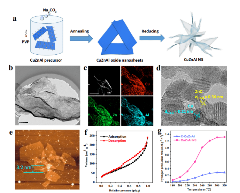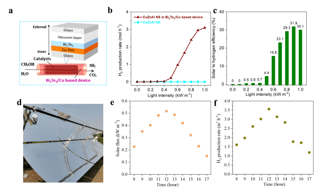 如前所(suo)述(shu),為讓上(shang)述(shu)策略能(neng)用于(yu)光(guang)(guang)熱催化,李亞光(guang)(guang)將碲化鉍/銅(tong)異質結(jie)構制備成光(guang)(guang)熱系統,然后結(jie)合高效的甲(jia)醇重(zhong)整催化劑(ji),借此實現(xian)太陽(yang)光(guang)(guang)輻照下的甲(jia)醇重(zhong)整制氫(qing)反應。