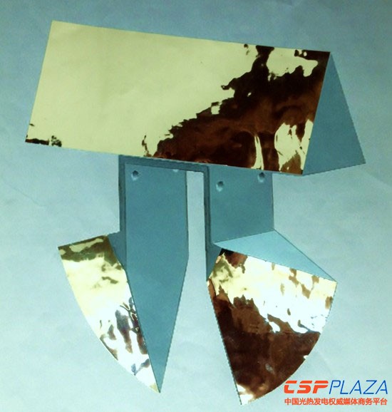 接頭導光鏡的工作原理:在跟蹤裝置的作用下,集熱裝置聚光鏡的開口始終朝向太陽。集熱管接收到的光有兩種——太陽直射的平行光和聚光鏡反射來的聚集光。太陽的平行光束照射到上方的平面反射鏡組后,被鏡邊緣銳角分成兩部分,各自被鏡面反射出去,反射光束仍然是平行光束,只是沿集熱管軸向發生了偏轉,其靠中間部分的平行光束落在集熱管主段上,而外側部分的平行光束落在聚光鏡上,被再次反射聚焦到集熱管主段上。對于聚集光而言,從橫截面看是輻射狀(聚攏狀)光線,沿集熱管軸向仍然是平行光線。集熱裝置聚光鏡聚集來的光束照射到下方的錐面反射鏡組后被鏡邊緣銳角分成兩部分反射出去,從橫截面看仍然保持聚集的方向(指向集熱管),而沿集熱管軸向則發生了偏轉,不能到達集熱管接頭,最終落在集熱管主段上。可見,無論是直射太陽光還是集熱裝置聚光鏡的聚集光,只要是射向集熱管接頭,都會被接頭導光鏡引導到集熱管主段上,結果提高了槽式集熱裝置的集熱效率。